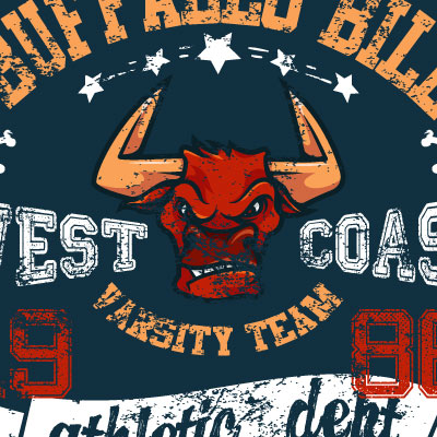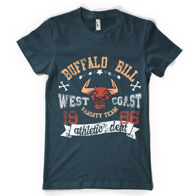 Vector t-shirt design featuring Bull Sports Mascot. Buffallo Bill T-shirt Design is available in vector format as Adobe Illustrator, Adobe Photoshop and PDF file and can be used for digital printing and screenprinting.