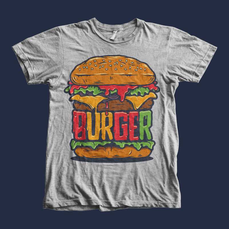 "Burger" typography style. This design use 1 colours on dark brown t-shirt. it is high quality vector format, easy for editing process, available for Adobe Illustrator, and Corel Draw and can be used for digital printing and screenprinting.