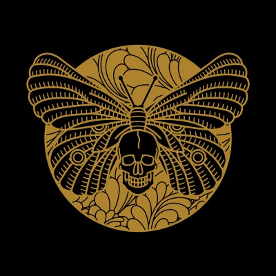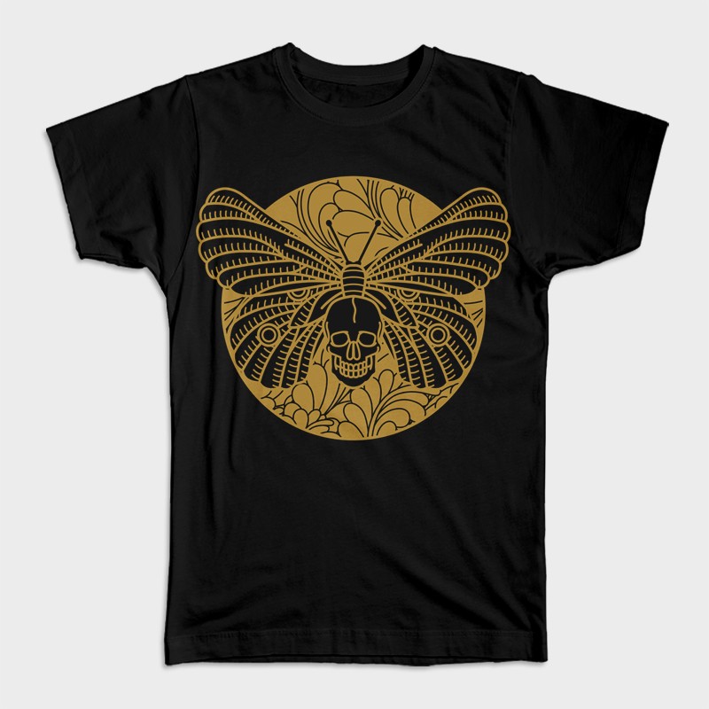 T-shirt design featuring a butterfly and a skull. The file available is suitable for Adobe Illustrator and can be used for digital printing and screenprinting.