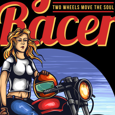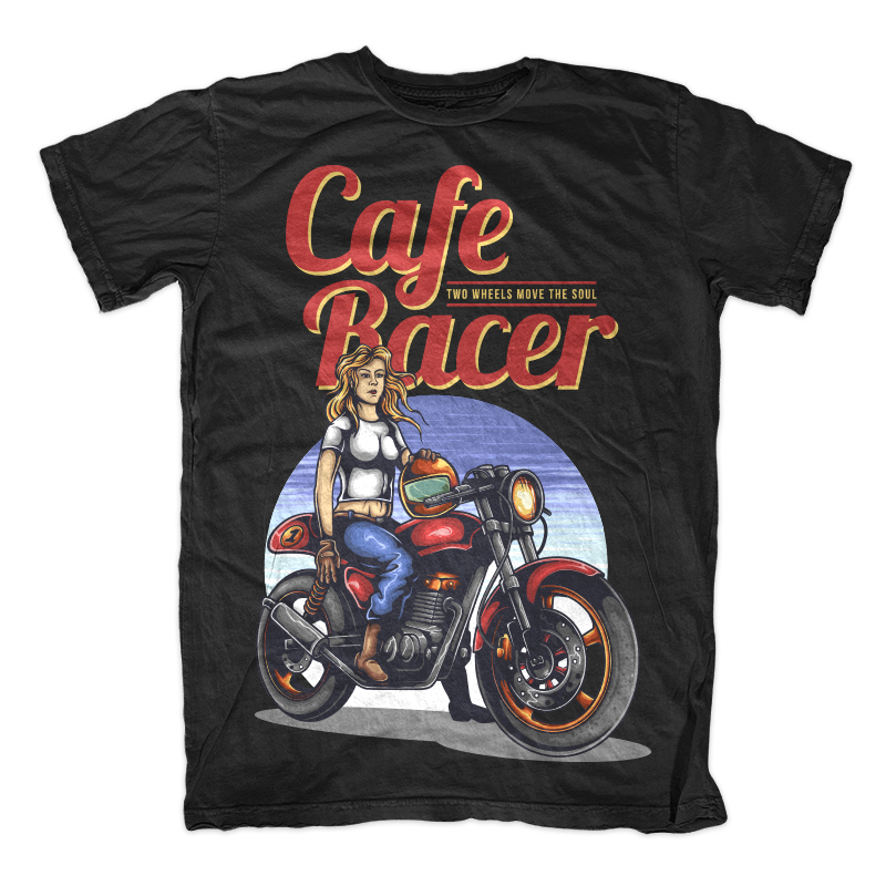 Vector illustration of blonde woman biker on cafe racer motorbike. Ready to print on t-shirt.