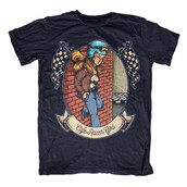 Illustration of cafe racer girl with helmet and banner standing on wall. Ready to print on t-shirt.