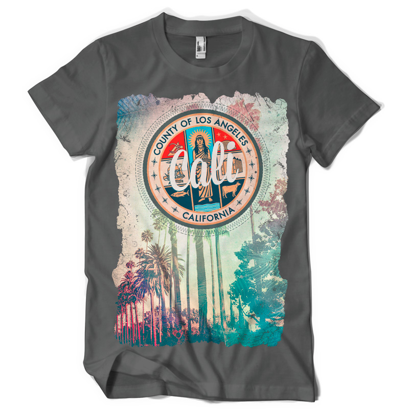 "cali" Artwork created in Adobe Photoshop. The file available for the client upon purchase and download are 1 layered file in TIFF (with transparency) format designed for DIRECT TO GARMENT printing. Also available upon request is 1 file in PDF format, layered, designed for the SCREEN PRINTING.