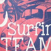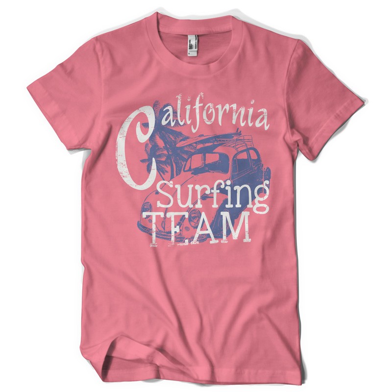 California surfing team digital design template in vector format, featuring detailed retro car now available for Adobe Illustrator, Adobe Photoshop and Corel Draw and can be used for digital printing and screenprinting .