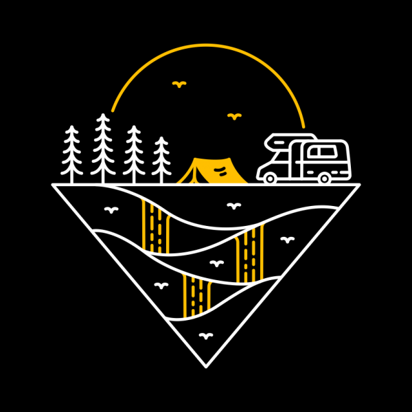 Camp Journey Begins is a monoline illustration that is suitable for apparel or merchandise about summer, vacation, holiday, van, camper van, camping, nature, outdoor, mountain, national park, adventure, travel, tent, journey, explore.