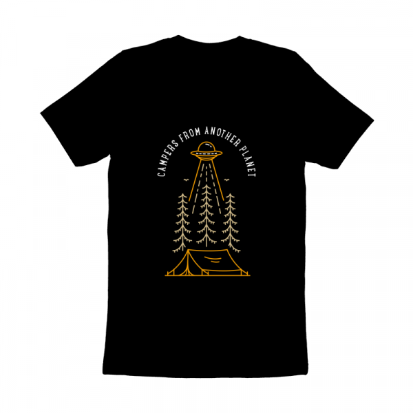 Campers from Another Planet is a monoline illustration that is suitable for apparel or merchandise about camping, camper, nature, outdoors, adventure, mountain, holiday, national park, space, ufo, alien, nasa, astronaut, galaxy, mars.