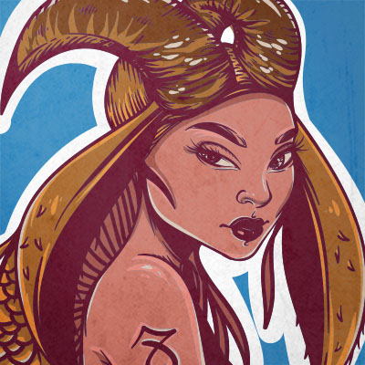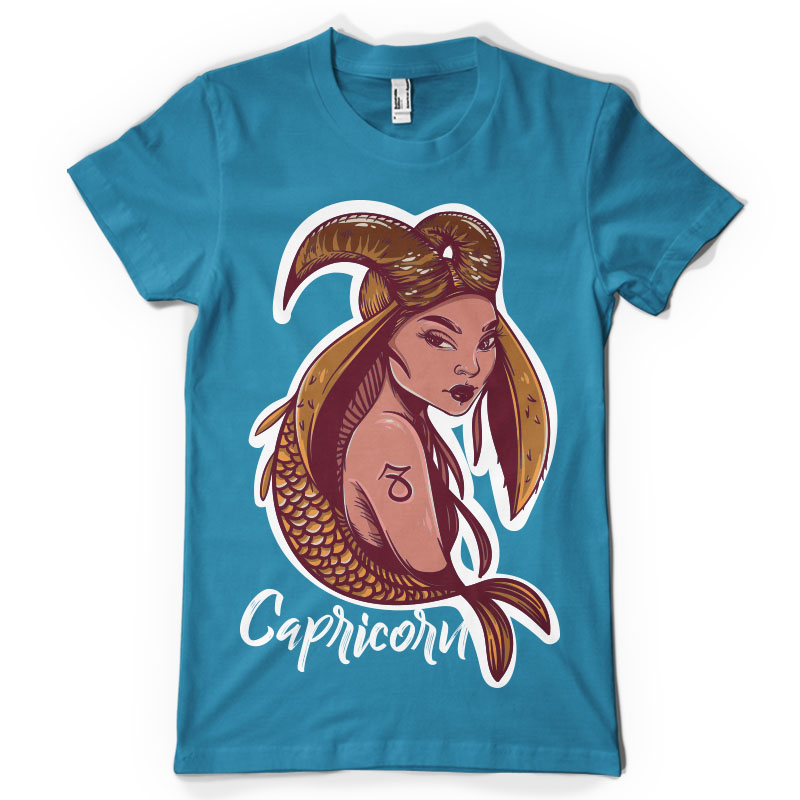Capricon- design featuring detailed portrait of a girl. This illustration was made in Ilustrator, the source file is avaible in PNG,AI,EPS,SVG format and can be used for screenprinting , digital print and tshirt design. Not editable text.