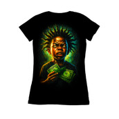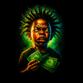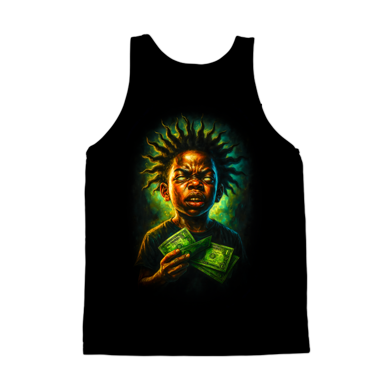 This striking design features a young individual with a defiant expression, holding a fan of dollar bills. The style is intensely graphic, with sharp contrasts and vibrant colors that create a sense of drama and energy. The subject's hair is styled in a distinctive, spiky manner, adding to the overall edgy aesthetic. The background is a swirl of nebulous green, providing a vivid backdrop that enhances the subject's presence. The artwork blends elements of street style with a touch of the surreal, making it visually arresting and memorable. The illustration style leans towards a modern, hyper-realistic rendering, with attention to detail in the textures and shading. The overall composition suggests themes of youth, attitude, and perhaps a commentary on wealth or ambition. This design would be perfect for urban-themed apparel, posters, or digital art projects. Designers could use this image to create edgy streetwear designs, album art, or attention-grabbing promotional materials. The bold style and subject matter would appeal to a younger demographic. It could also be incorporated into digital art projects or used as a statement piece in various visual media. The design's strong visual impact makes it highly versatile.