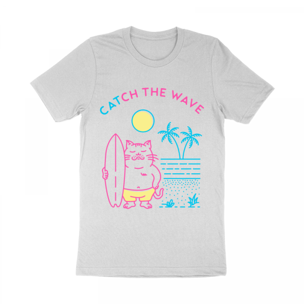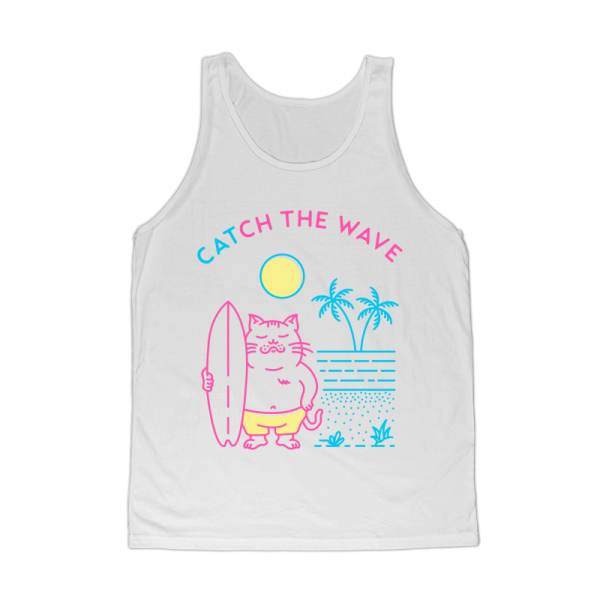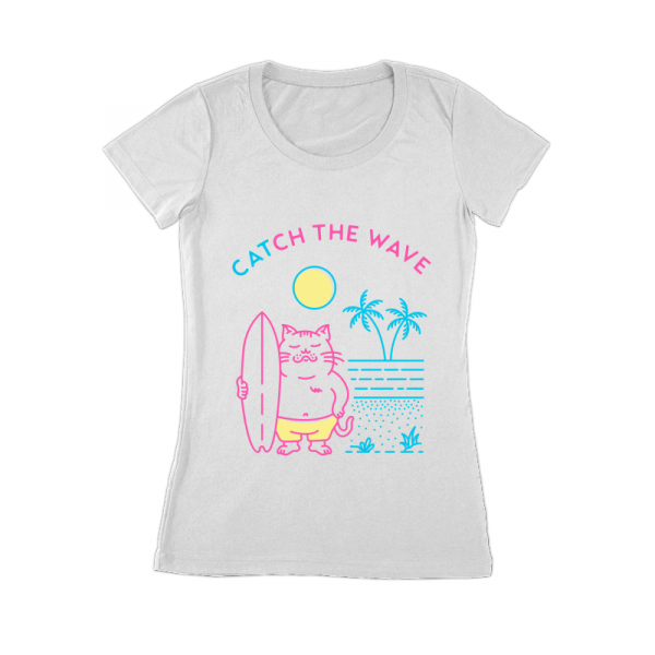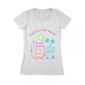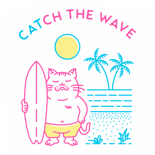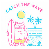 is a monoline illustration that is suitable for apparel or merchandise about nature, summer, vacation, holiday, travel, beach, sea, tropical, paradise, cat, animal, cute, funny, surfing, surfboard.