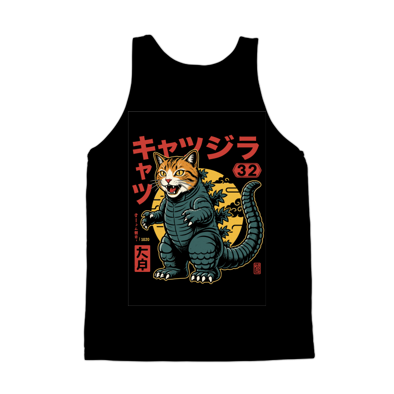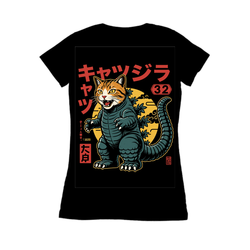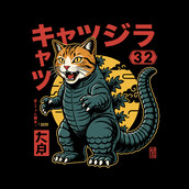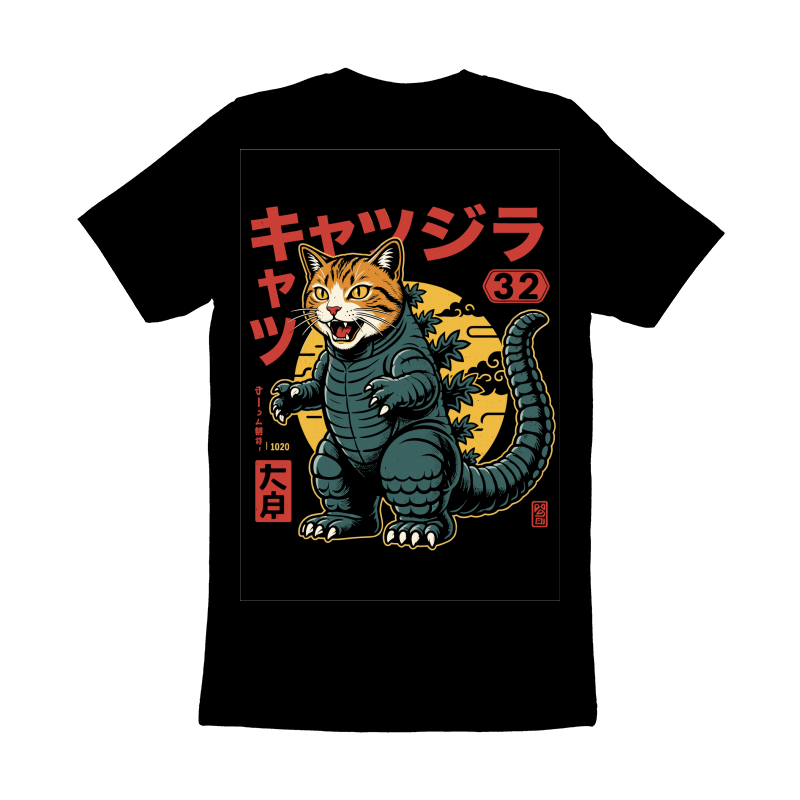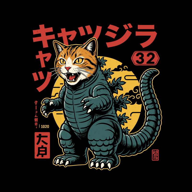 This design features a striking fusion of a cat and Godzilla, creating a humorous and eye-catching character. The cat's head, complete with orange tabby stripes and piercing yellow eyes, sits atop a stylized Godzilla body. The body is rendered in shades of teal and green, with the iconic dorsal fins running down its back and tail. The design incorporates Japanese text and symbols, adding to the overall aesthetic. A yellow moon provides a backdrop, enhancing the monster movie vibe. The illustration style is reminiscent of vintage posters and comic book art, with bold outlines and a limited color palette. The overall effect is both playful and visually engaging, appealing to fans of cats, kaiju, and Japanese pop culture.