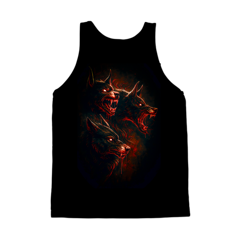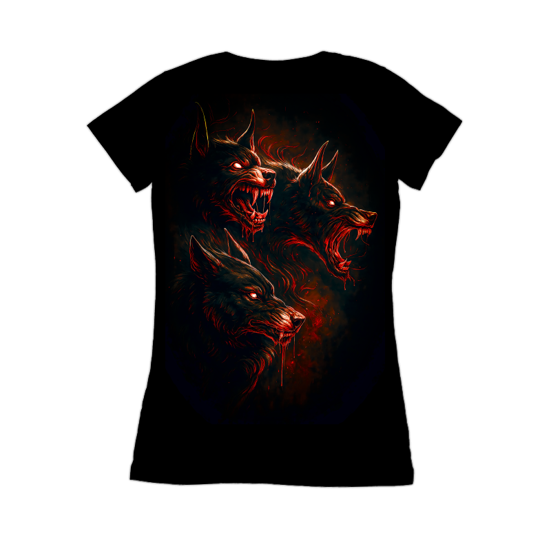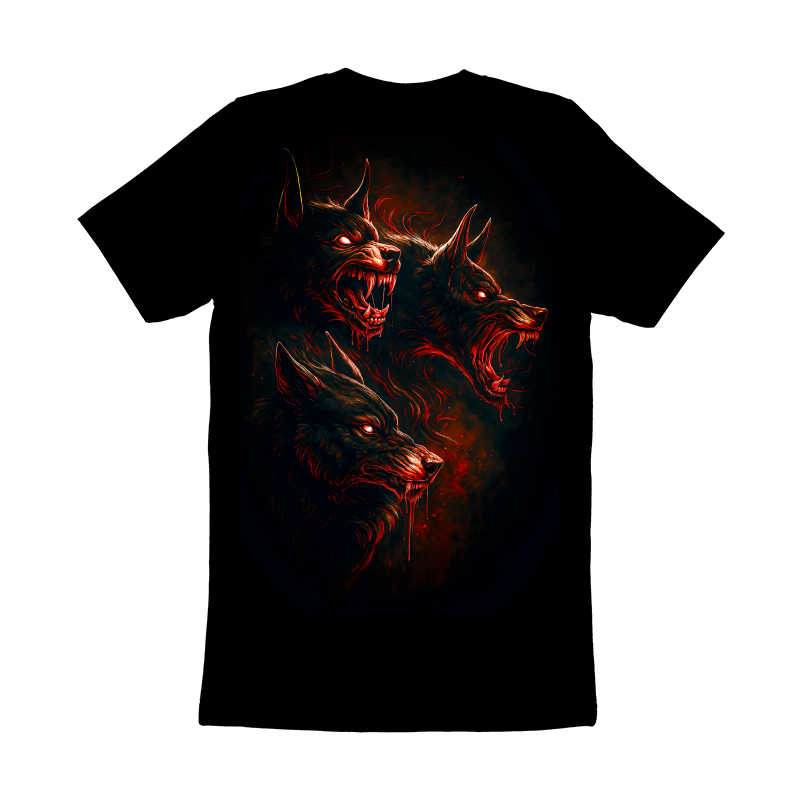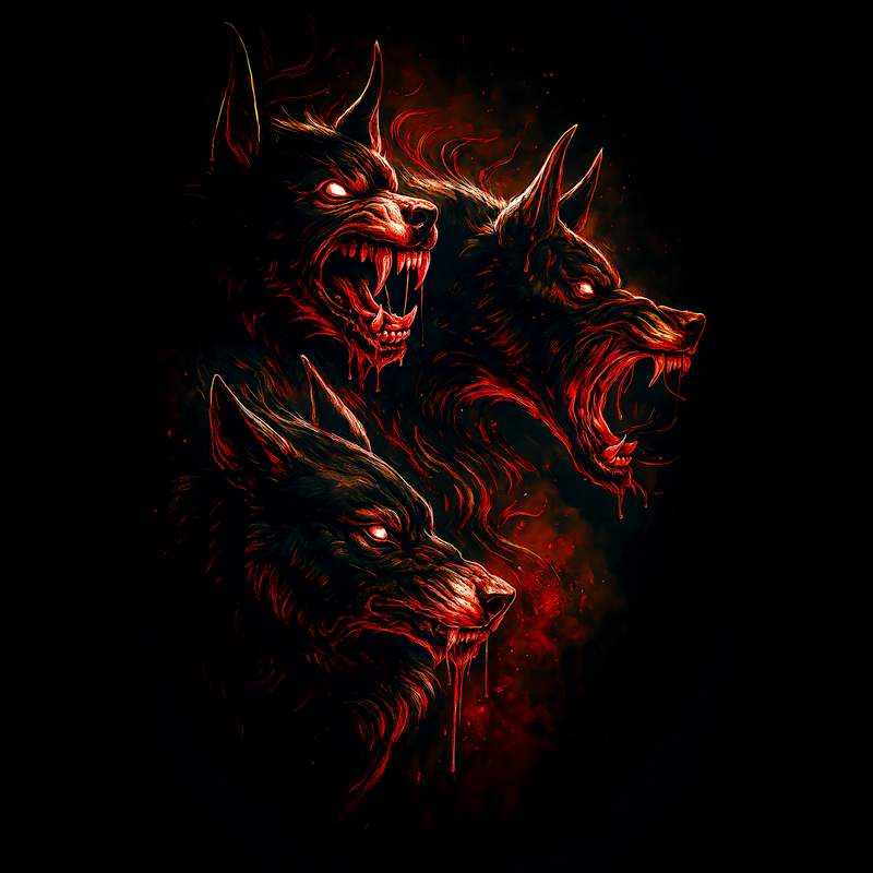 This artwork presents a fearsome depiction of Cerberus, the mythical multi-headed dog guarding the gates of the Underworld. The design is dominated by dark tones, with the three heads of the beast rendered in intricate detail. Each head displays snarling features and sharp teeth, emphasized by glowing red eyes that pierce through the darkness. Blood drips from their muzzles, adding to the menacing atmosphere. The use of red highlights against the dark background creates a striking contrast, enhancing the intensity of the scene. The overall style blends dark fantasy with elements of horror, creating a visually captivating and unsettling image. The texture and shading give the artwork a sense of depth and realism, making Cerberus appear both powerful and terrifying.
