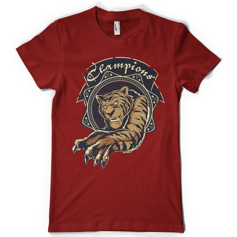 Champion mascot printed t-shirt features a detailed screen print of mad tiger ready to win now available in EPS format and can be used for digital printing and screenprinting . Ready to print or use in anything you want.