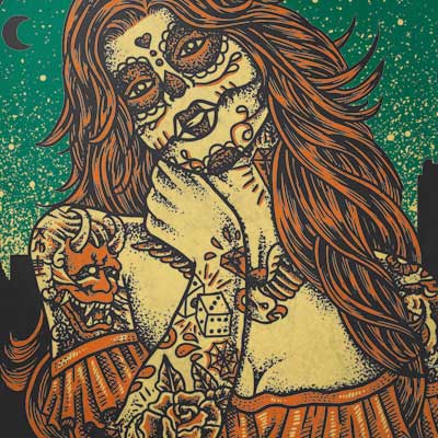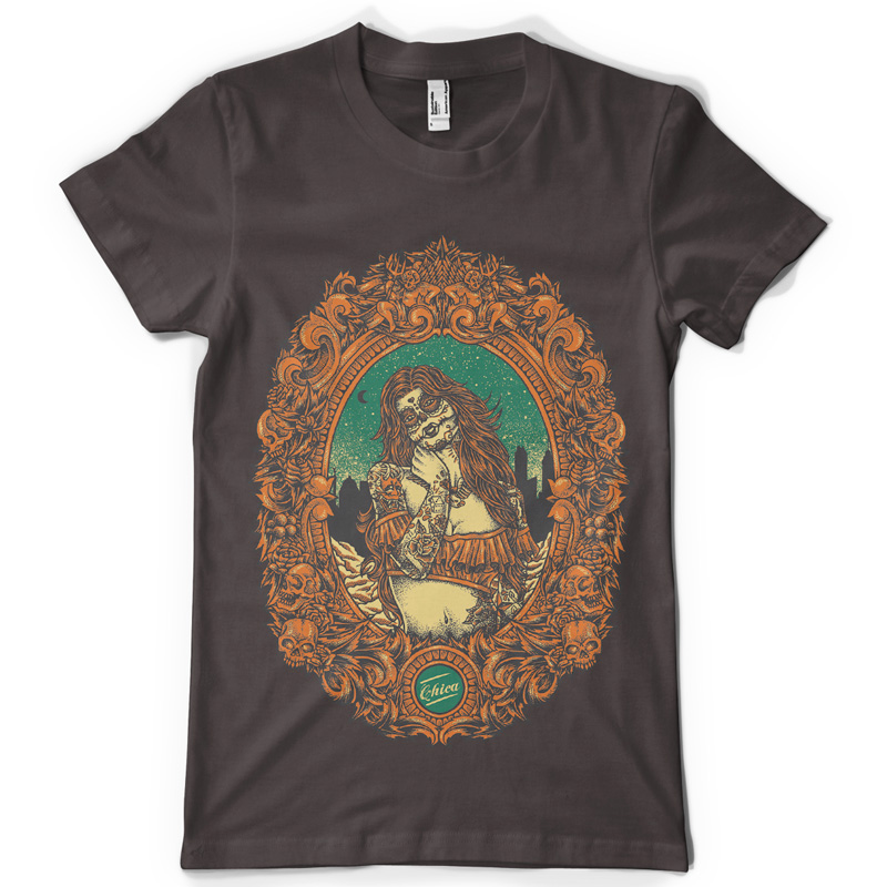 Chica no Muerta t-shirt design. Artwork for printing featuring tattoed woman, sorrounded by a rich frame, mirror or adorned window. Infinitely scalable file. - Vector files editable, organized in layers, ready for screenprinting or digital printing .