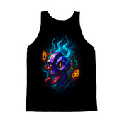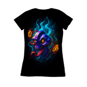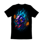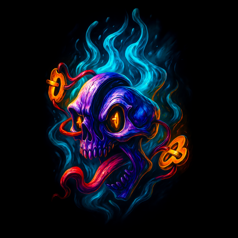 This striking design features a vividly colored skull with an open mouth and extended tongue, set against a backdrop of swirling blue flames. The skull is rendered in shades of purple and blue, creating a visually arresting effect. The eyes glow with an eerie orange light, adding to the design's macabre appeal. Attached to the skull are two golden keys, connected by a winding red cord, which adds an element of mystery and intrigue. The artwork is highly detailed, with intricate shading and texture that give it a three-dimensional quality. The design style is reminiscent of tattoo art, with bold lines and vibrant colors that make it stand out. Designers could use this image for a variety of purposes, including t-shirt designs, posters, and album art. The bold colors and striking imagery would make it a great fit for edgy or alternative brands. It could also be used for Halloween-themed products or designs related to music, gaming, or horror.