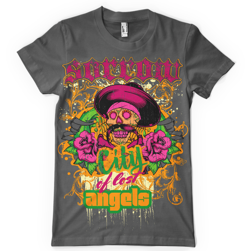 City of lost angels printed t-shirt features a detailed screen print of sugar mexican skull is now available in EPS format file and can be used for digital printing and screenprinting . Ready to print or use in anything you want.