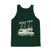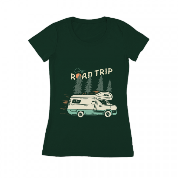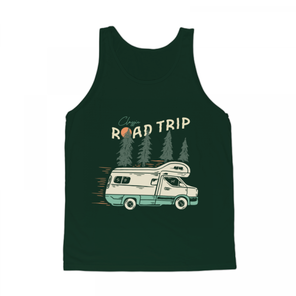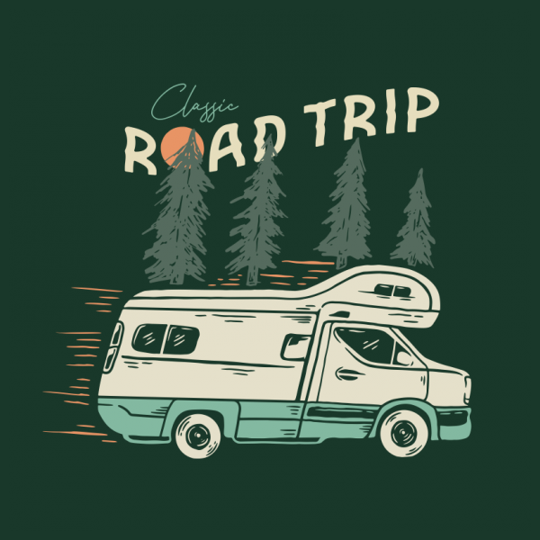 Classic Road Trip is a vintage illustration that is suitable for apparel or merchandise about nature, outdoors, mountain, adventure, vehicle, car, transportation, journey, trip, van, travel.