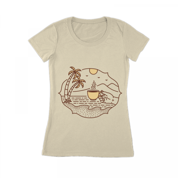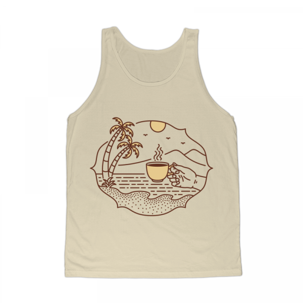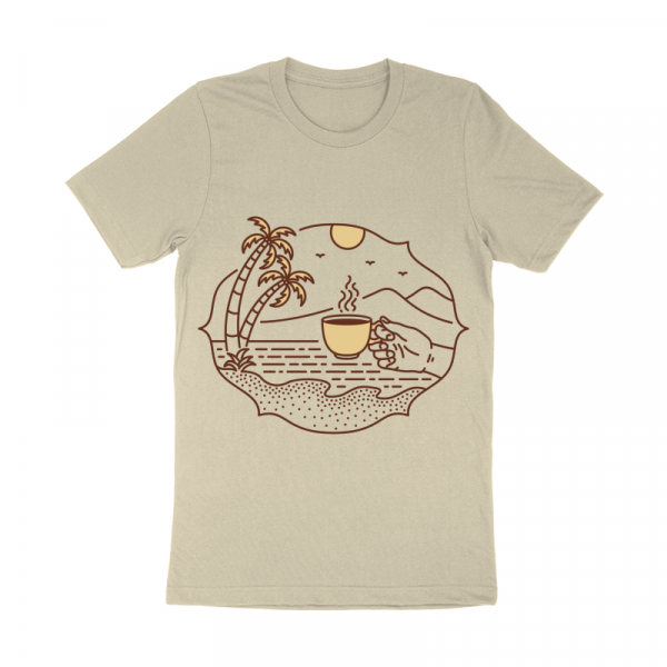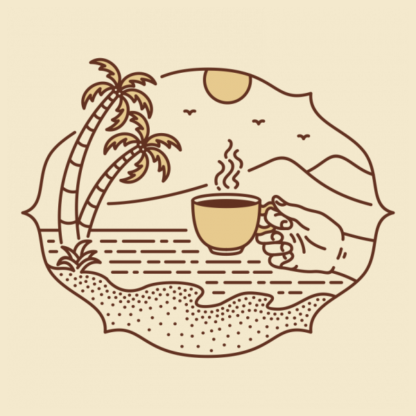 Is a monoline illustration that is suitable for apparel or merchandise about coffee, drink, caffeine, beverage, espresso, barista, cappuccino, americano, beach, summer, nature, vacation, camping, travel, holiday.