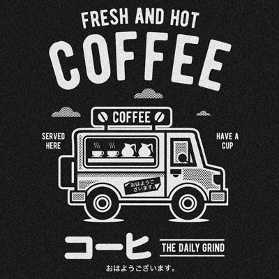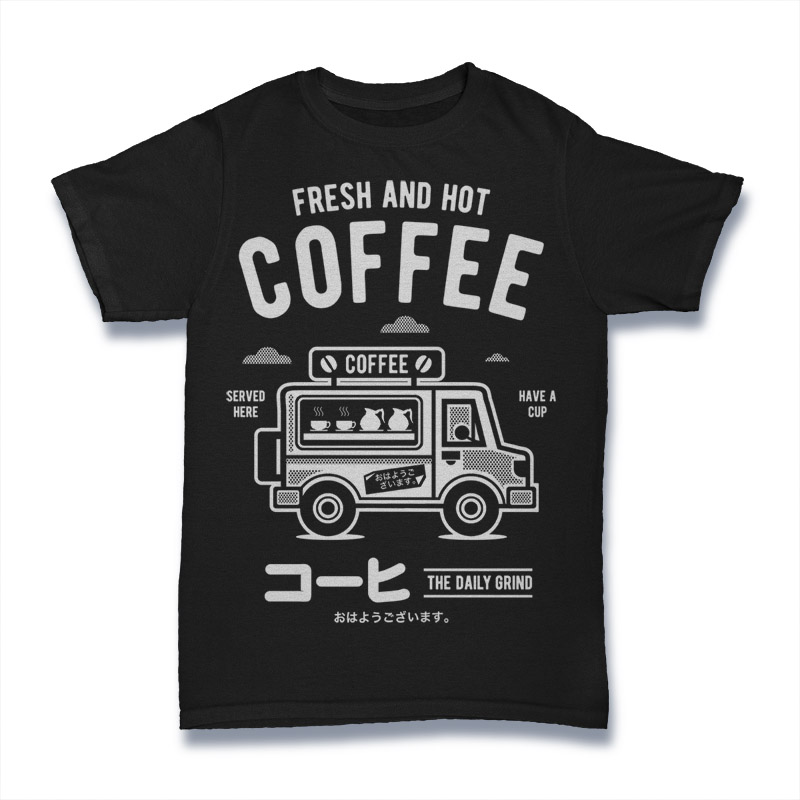 Coffee Van Cartoon character style T-shirt design template , The files are AI, CDR, PSD separated Layers. Can be used for digital printing and screen printing.