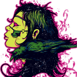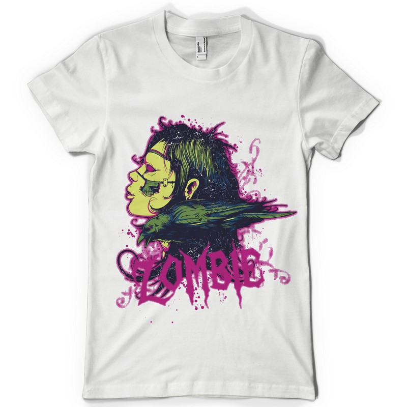 Companion digital design template in vector format, featuring detailed zombie with his raven companion now available for Adobe Illustrator, Adobe Photoshop and Corel Draw and can be used for digital printing and screenprinting .