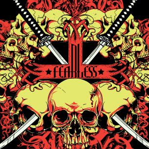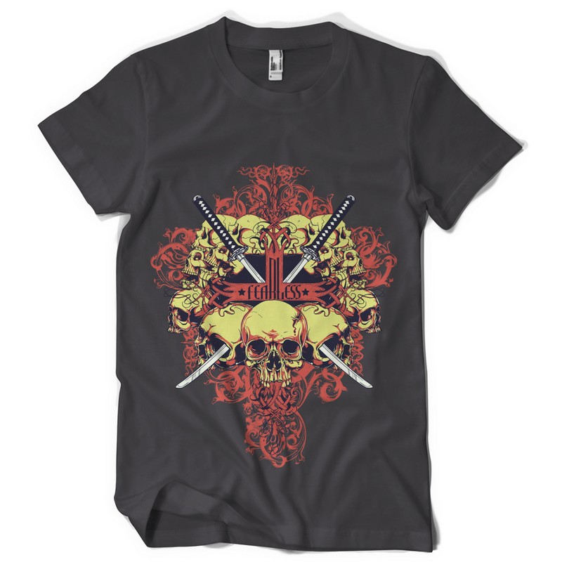 Confrontation graphic design template in vector format, featuring detailed skulls and katanas now available for Adobe Illustrator, Adobe Photoshop and Corel Draw and can be used for digital printing and screenprinting .