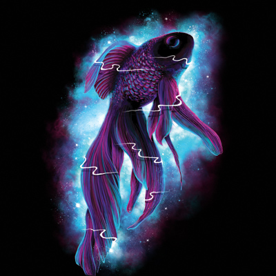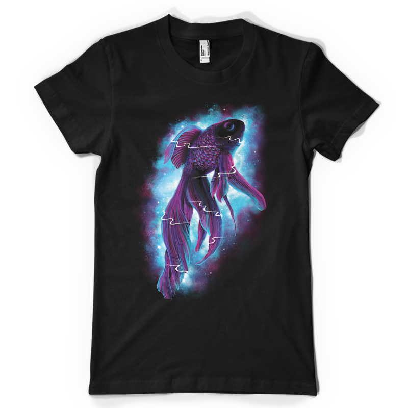 "Cosmic Ripple" is a unique illustration of a fish taking a dip into space with a mixture of modern and grunge style. Vibrant colors are used to make this pop on tee! File contains a PSD file with 17 x 24 in size.