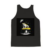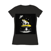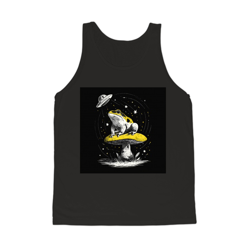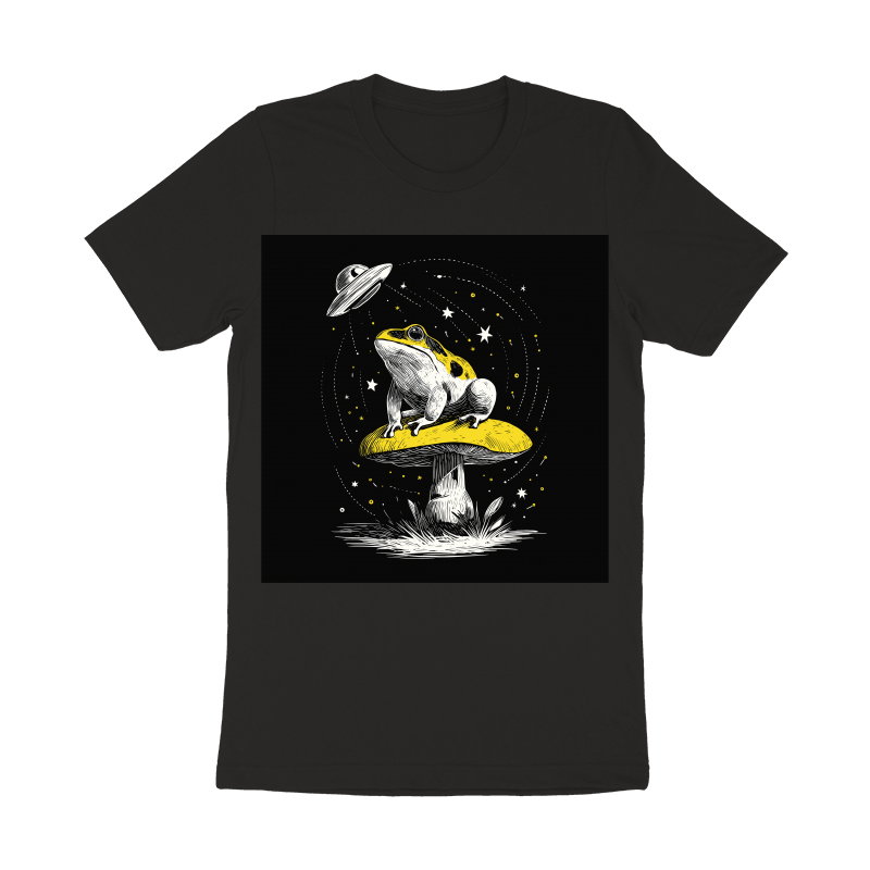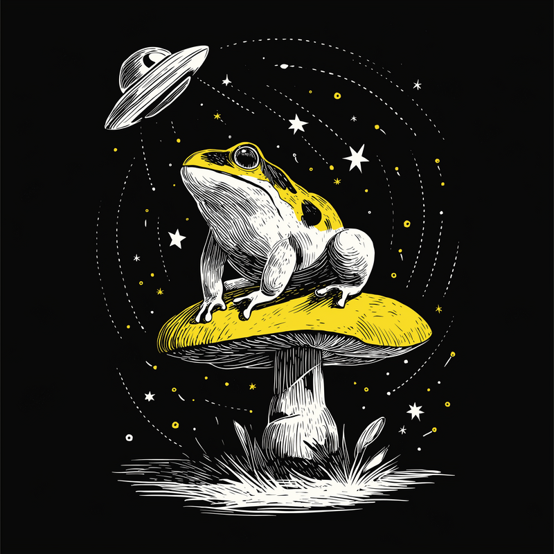 This captivating design features a frog perched atop a mushroom, bathed in the ethereal glow of a UFO. The artwork is rendered in a detailed, vintage-inspired style, with intricate linework that gives it a hand-drawn feel. The frog, with its distinctive markings, sits regally on the mushroom, seemingly unfazed by the otherworldly visitor. Above, a classic flying saucer hovers, casting beams of light down upon the scene. The composition is balanced and visually striking, with a black background that accentuates the vibrant colors of the frog and mushroom. The design evokes a sense of wonder and mystery, blending elements of nature with science fiction.