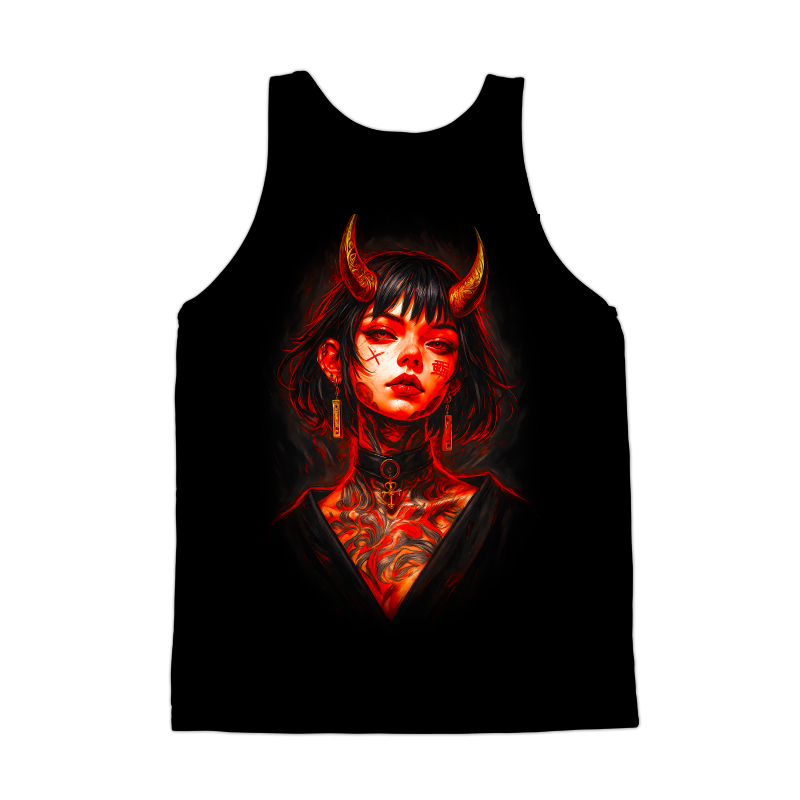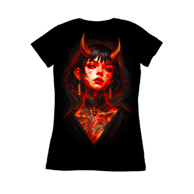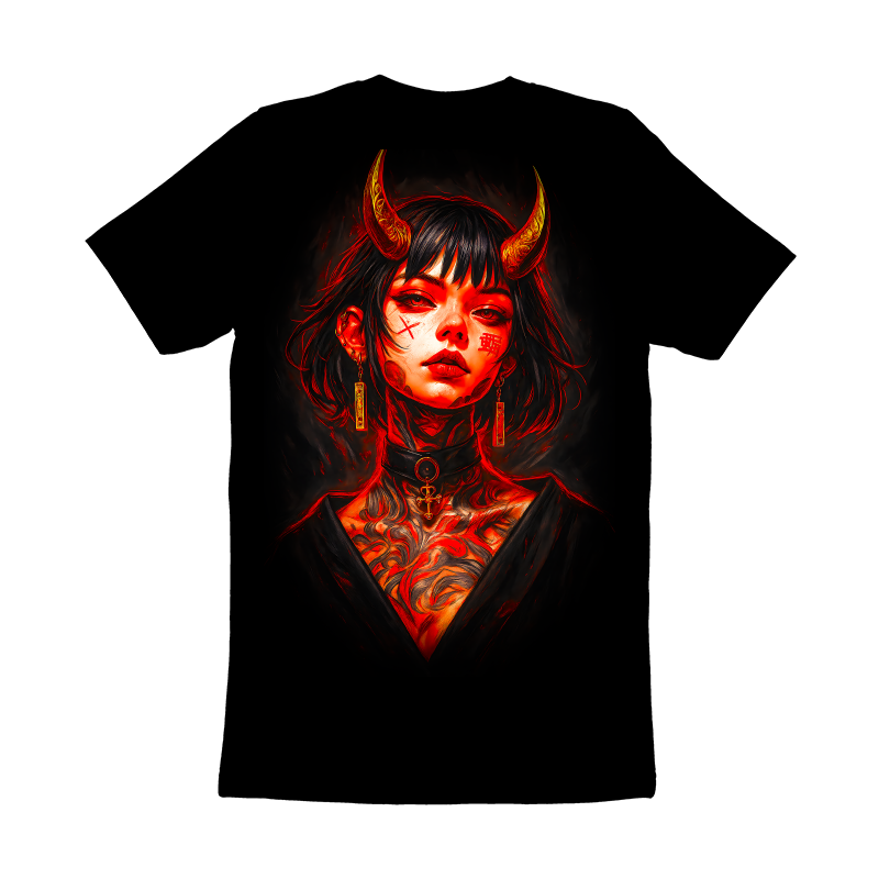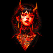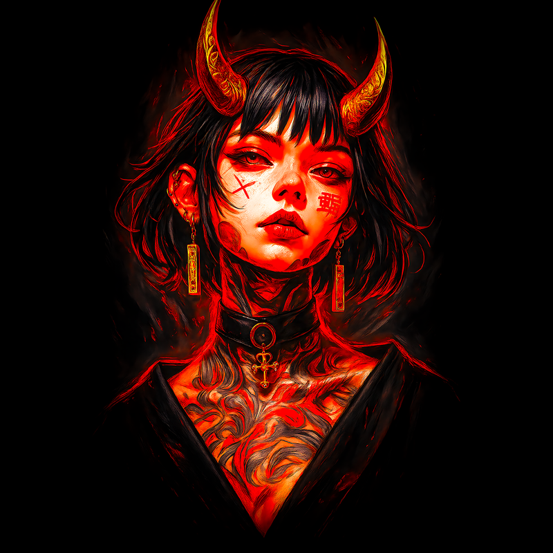 This artwork presents a striking depiction of a devilish woman, rendered in a vibrant red palette against a stark black background. The character sports ornate golden horns and a bold choker with a pendant, adding to her mystique. Tattoos adorn her chest and face, incorporating abstract and geometric designs. The artist skillfully uses light and shadow to create depth and drama, emphasizing the intensity of her gaze and the texture of her hair. The overall effect is both alluring and intimidating, blending elements of dark fantasy with contemporary aesthetics. The design features a unique mix of traditional and modern elements, making it visually appealing and thought-provoking. Designers could utilize this striking image for various projects, including posters, album art, or apparel designs. Its edgy and unique style would appeal to audiences interested in alternative fashion, gothic themes, or dark fantasy. The detailed tattoos and bold color palette make it a great focal point for graphic design projects seeking a bold and memorable aesthetic.