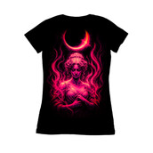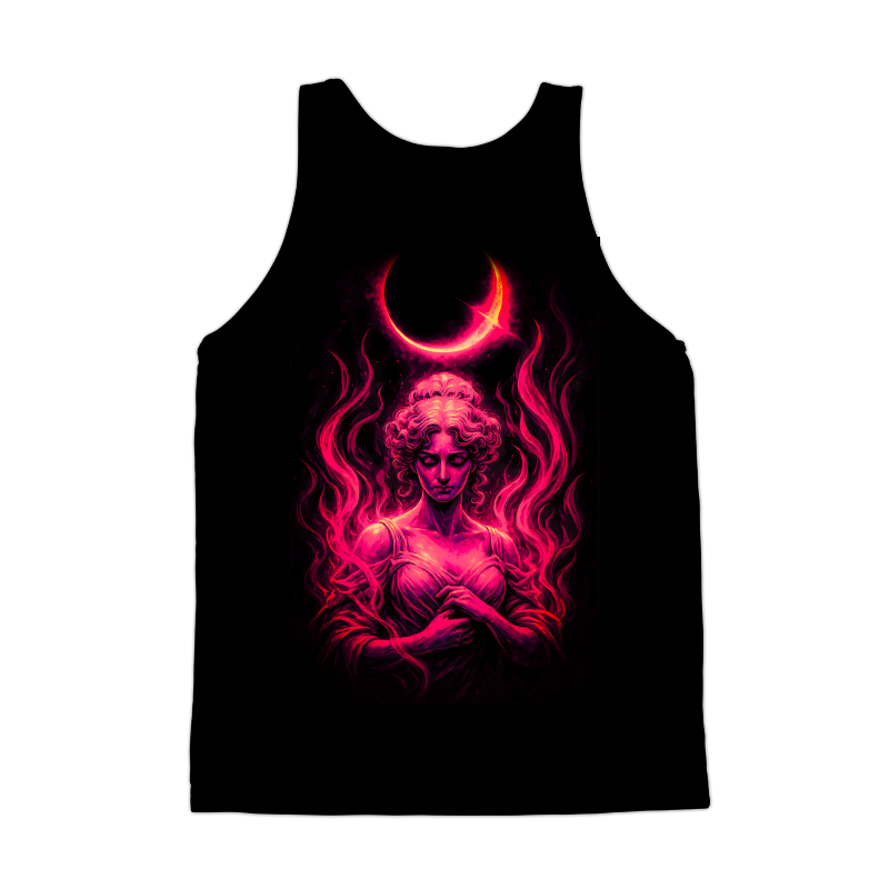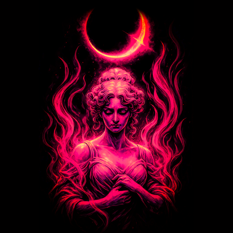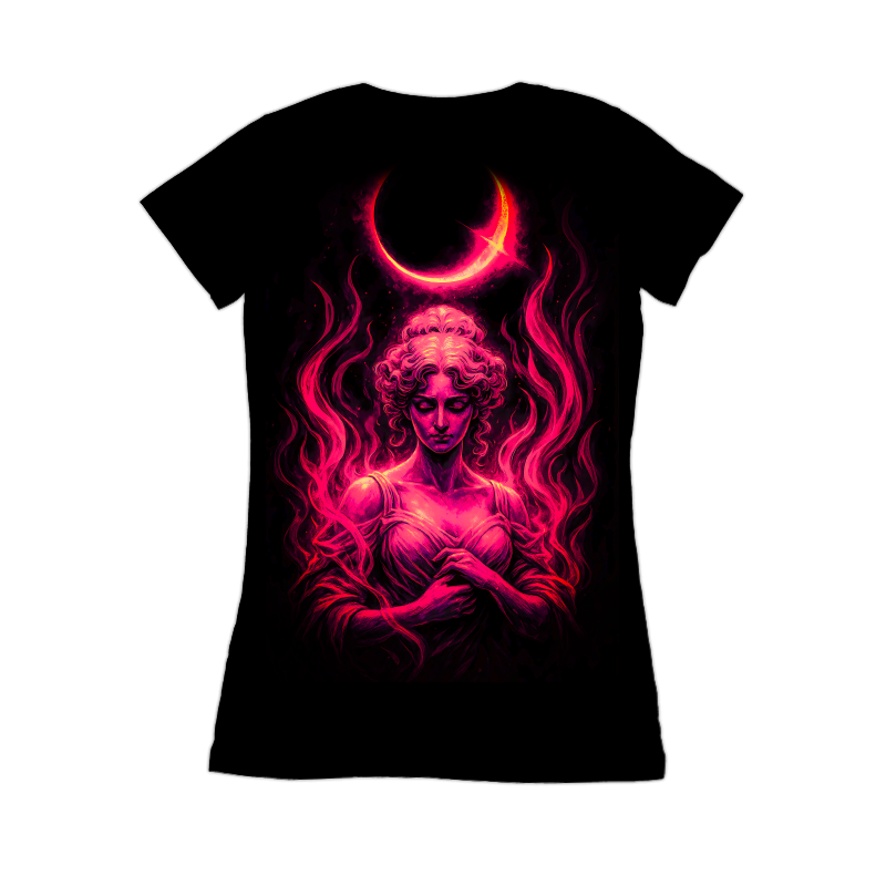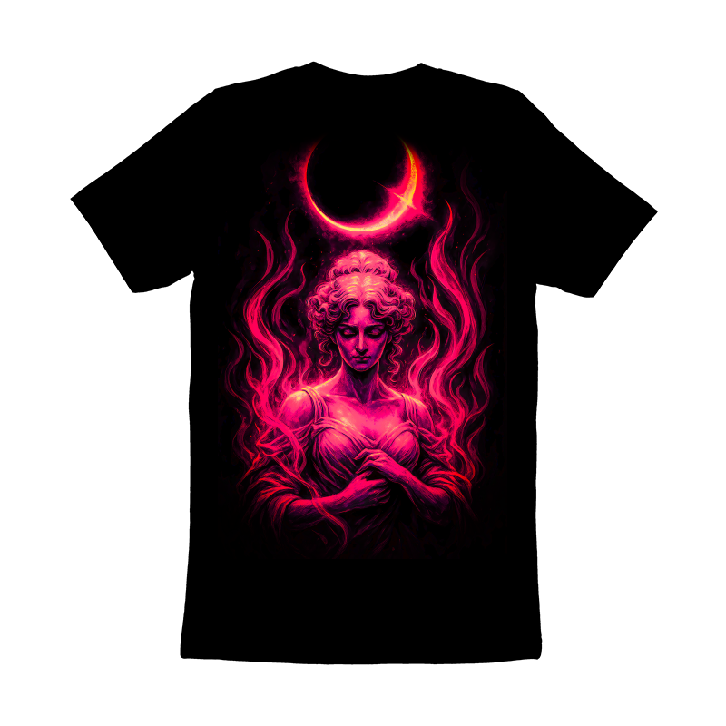 This design features a stylized depiction of a goddess figure, bathed in a vibrant crimson light against a stark black background. Above her head, a crescent moon glows with a fiery intensity, mirroring the radiant energy that seems to emanate from the goddess herself. Her expression is serene, with eyes closed in contemplation or meditation. The flowing lines of her garment and the ethereal flames surrounding her create a sense of movement and dynamism. The overall effect is both powerful and mystical, evoking themes of feminine strength, celestial energy, and inner peace. The color palette is limited, yet the contrast between the crimson and black enhances the visual impact and creates a striking, memorable image.
