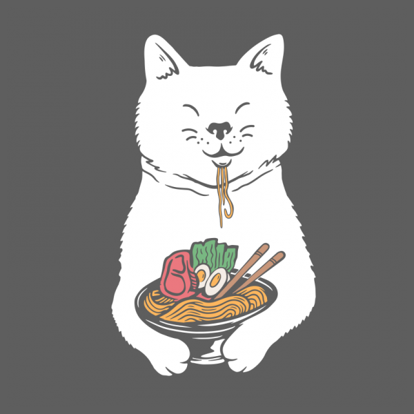 Cute Cat Eating Ramen is a vintage illustration that is suitable for apparel or merchandise about cat, animal, cute, pet, kitten, kitty, ramen, noodle, ramen noodles, food, japanese, udon.