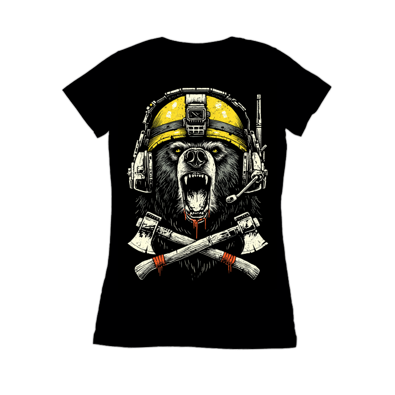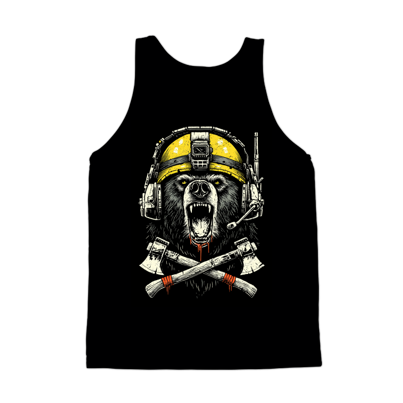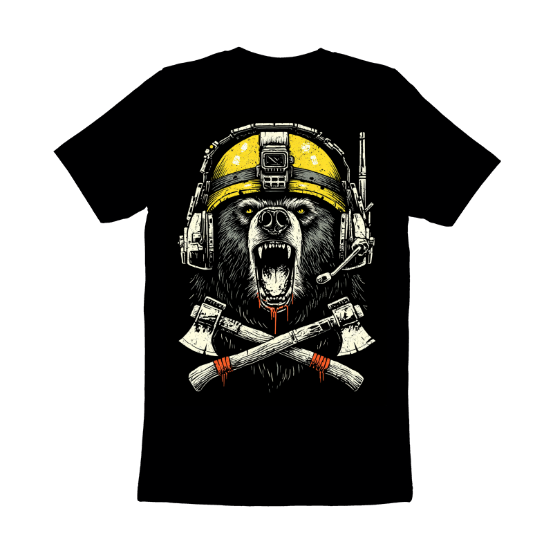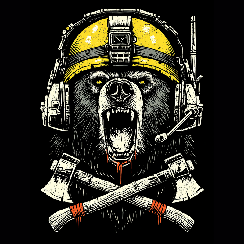 This striking design features a grizzly bear rendered in a bold, graphic style. The bear is depicted with a menacing snarl, showcasing sharp teeth and intense eyes. Adding a futuristic twist, the bear is equipped with a cyberpunk-style helmet and headset, complete with intricate mechanical details. Below the bear's head are two crossed axes, adding a touch of danger and ruggedness to the composition. The color palette is limited to black, white, and shades of gray, with small accents of yellow and red, enhancing the design's stark and edgy feel. The overall effect is a powerful blend of nature and technology, creating a visually compelling image.