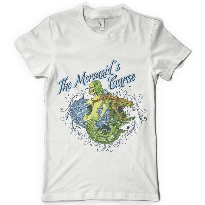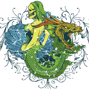 Damnation digital design template in vector format, featuring detailed mermaid skull now available for Adobe Illustrator, Adobe Photoshop and Corel Draw and can be used for digital printing and screenprinting .
