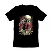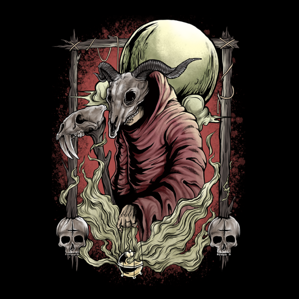 Illustration of dark preacher walking carrying incense. he wearing a skull helmet motif. This artwork very fit with your band merch, tattoo design or biker's club merch.
