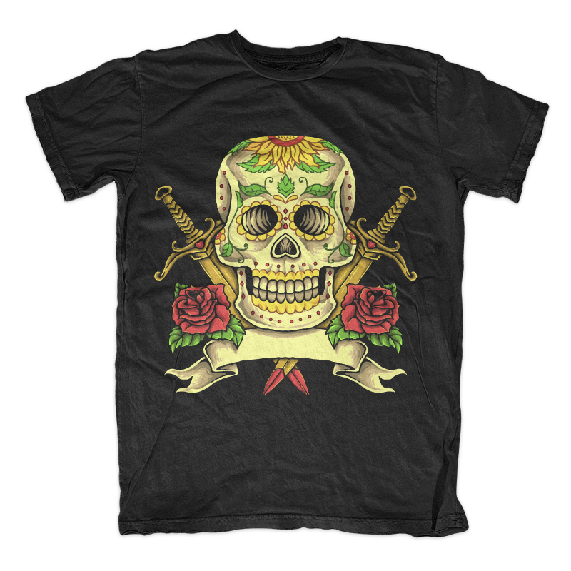Illustration of day of the dead skull sugar with floral, ornament, sword and banner to put text. Ready to print on t-shirt.