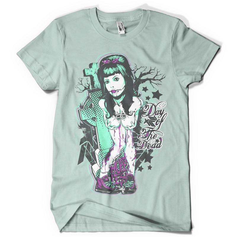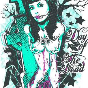 Day of the dead graphic design template in vector format, featuring detailed sexy zombie now available for Adobe Illustrator, Adobe Photoshop and Corel Draw and can be used for digital printing and screenprinting .