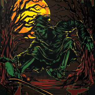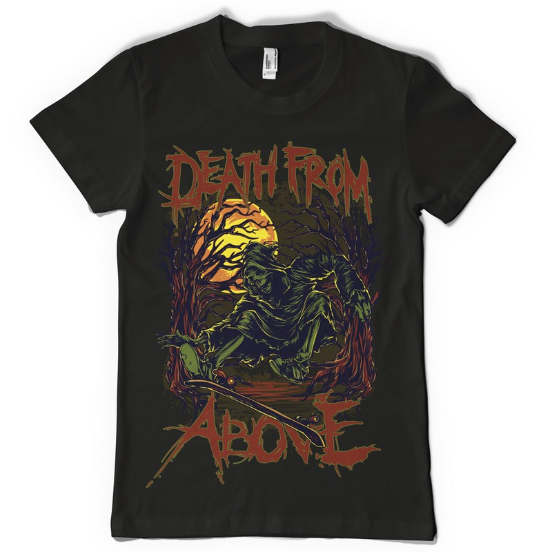 Death from above printed t-shirt features a detailed screen print of a grim reaper on the skateboard in the middle of the night is now available for Adobe Illustrator, Adobe Photoshop and Corel Draw and can be used for digital printing and screenprinting . Ready to print or use in anything you want.