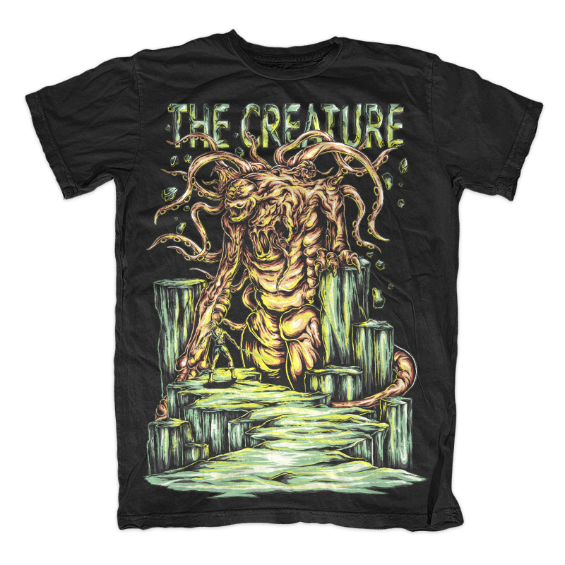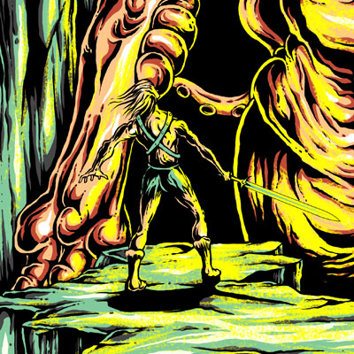 Illustration of a warrior ready to fight with giant monster on a dangerous cliff. This illustration made with vintage comic style. Ready to print on t-shirt.