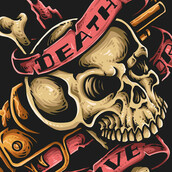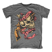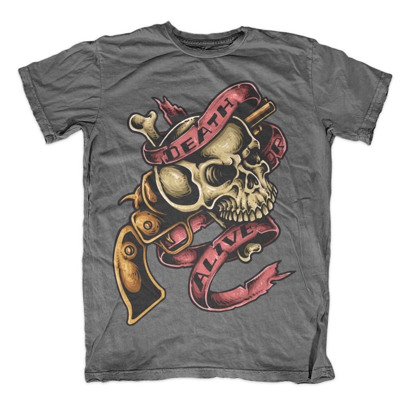 Vector illustration of skull, banner and gun in a vintage tattoo style. Ready to print on t-shirt.