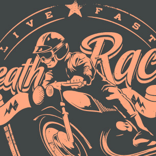Death race graphic design template in vector format, featuring detailed bike rider now available for Adobe Illustrator, Adobe Photoshop and Corel Draw and can be used for digital printing and screenprinting .