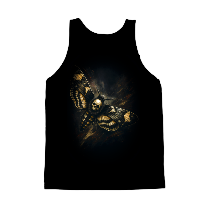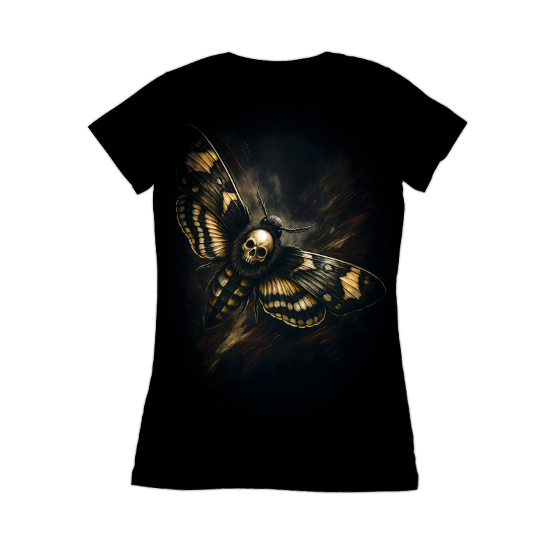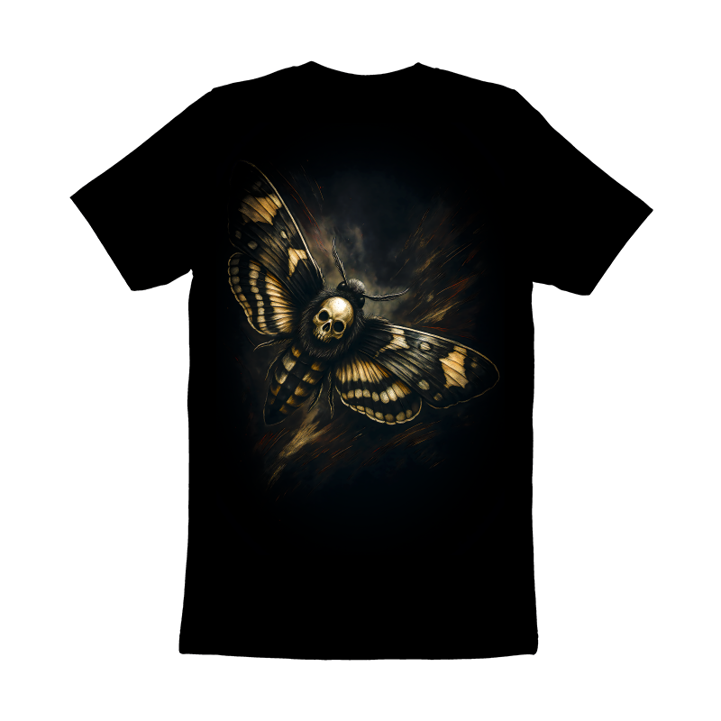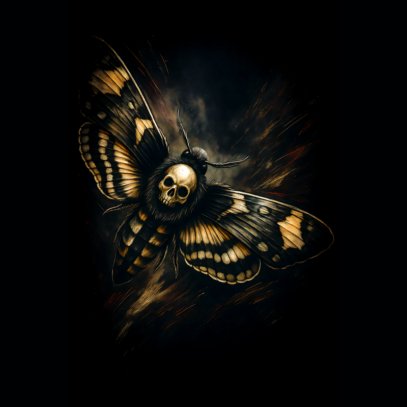 This striking design features a Death's-Head Hawkmoth, but with a twist—the moth's thorax is replaced with a human skull, creating a powerful juxtaposition of life and death. The moth's wings display intricate patterns of black and gold, rendered with a slightly distressed, vintage feel. The artwork evokes a sense of gothic elegance and macabre beauty, drawing inspiration from Victorian-era mourning art and classic horror illustrations. The color palette is dominated by dark tones, with highlights of gold and cream that accentuate the details. The overall effect is both haunting and captivating, making it suitable for a wide range of applications. Designers could use this image for apparel, particularly t-shirts and hoodies. It would also work well for posters, album art, and tattoo designs. The gothic and slightly edgy aesthetic makes it appealing to alternative subcultures, while the intricate details and vintage feel could attract a broader audience interested in unique and visually striking art.