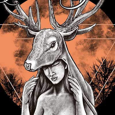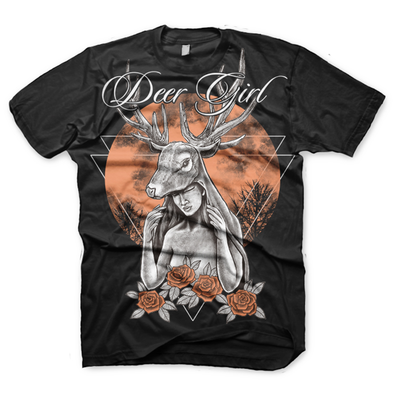 ''deer girl '' is unique Illustration of a girl and deer with a some of roses. with the dark orange moon for background and use pastel colors pallete...Made with hand painting looking and dark style. Ready to print on t-shirt.