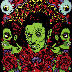 Zombie with moustache between woman sugar skulls