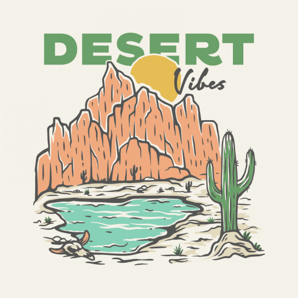 Desert Vibes 2 is a vintage handdrawn illustration that is suitable for apparel or merchandise about nature, outdoors, desert, cactus, wildwest, arizona, national park, arches, canyon, sahara, succulent, utah, wildlife, adventure, mirage, cowboy.