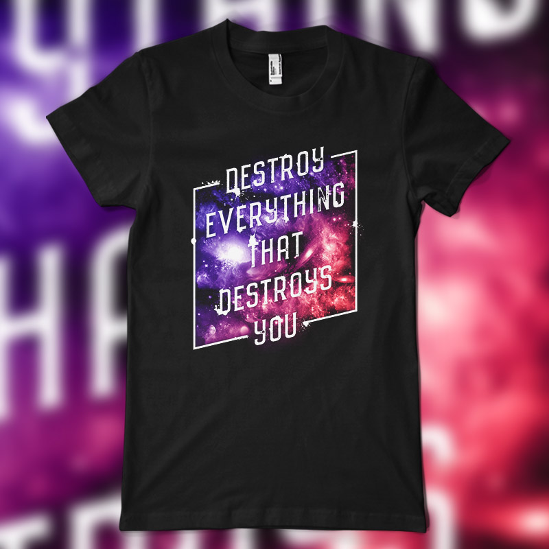"Destroy Everything That Destroys You" is a unique typography design with a mixture of digital painting and unique eye-catching colors that would stand out on a tee or any product. File contains a PSD file and a PNG file with 300 in resolution.