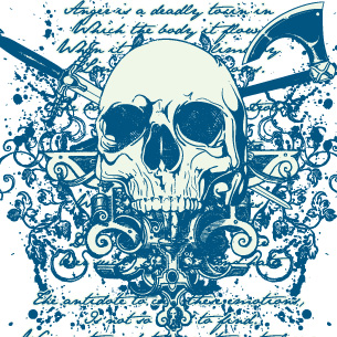 Sword and axe stabbed skull on poem background