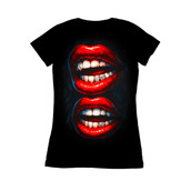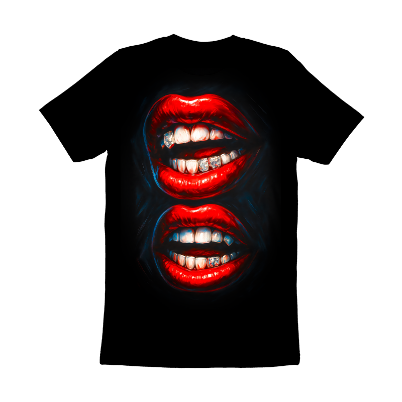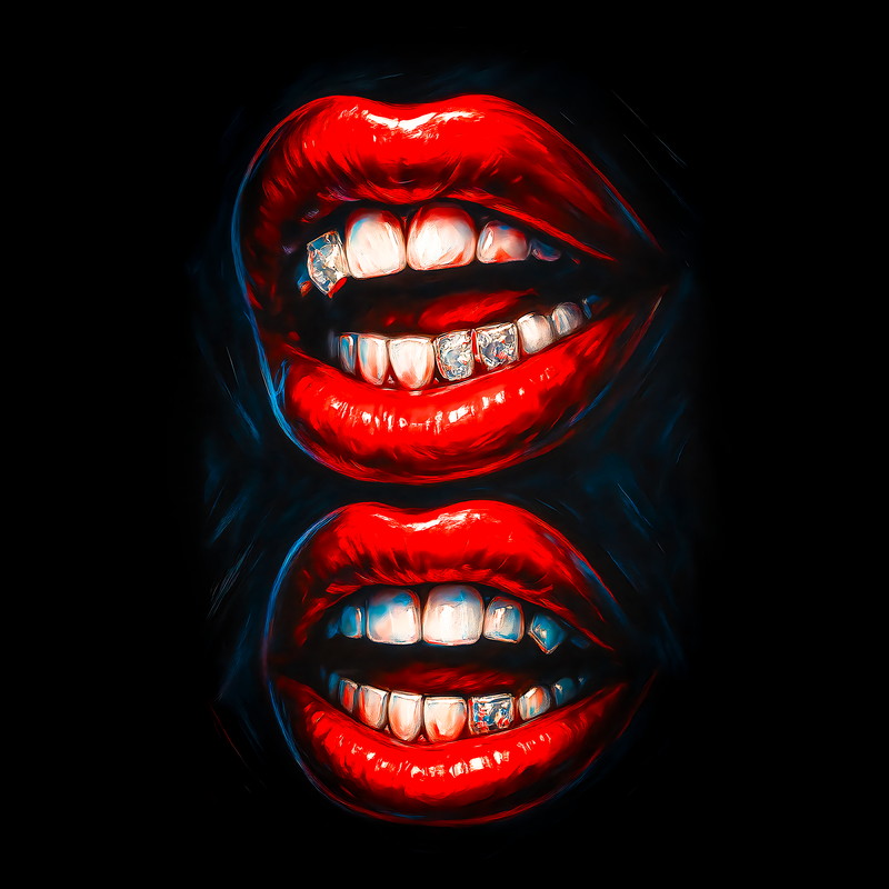 This striking design features a close-up, mirrored image of a pair of open mouths, each showcasing bright red lipstick and dazzling diamond-studded grillz. The artwork employs a bold, hyperrealistic style, emphasizing the glossy texture of the lips and the sparkling facets of the diamonds. The color palette is dominated by vibrant reds, stark whites, and the glittering silver of the grillz, set against a deep black background that enhances the contrast and visual impact. The mirrored composition adds a layer of symmetry and visual interest, drawing the viewer's eye to the intricate details of the teeth and the luxurious grillz. Overall, the design exudes a sense of confidence, glamour, and urban edge.