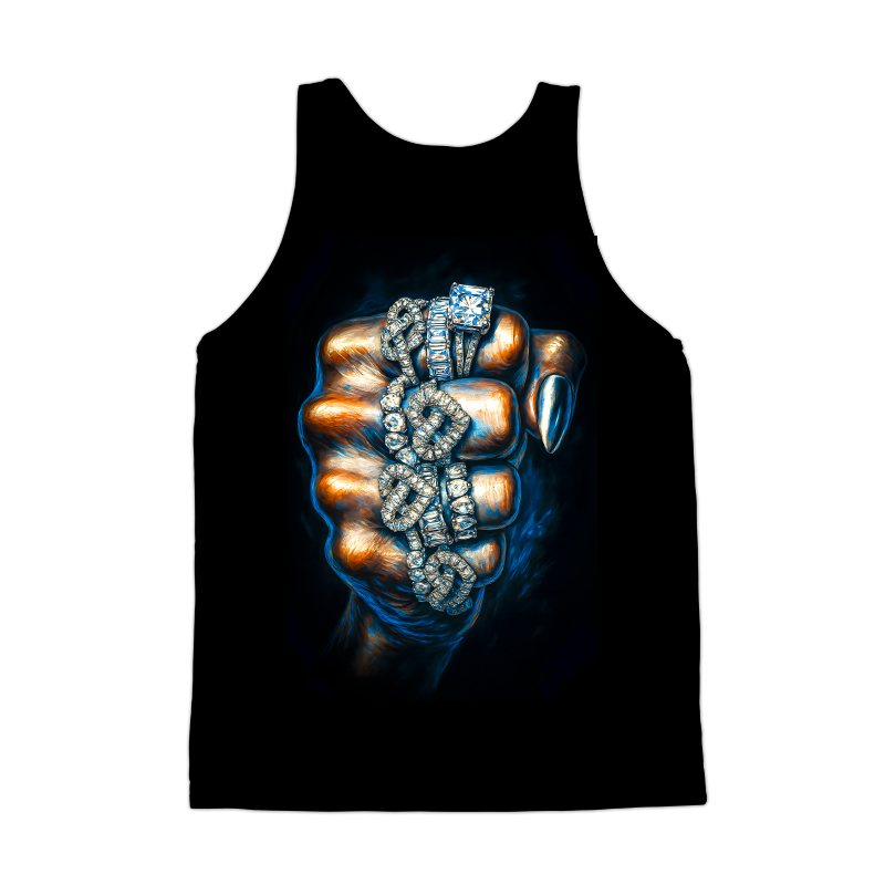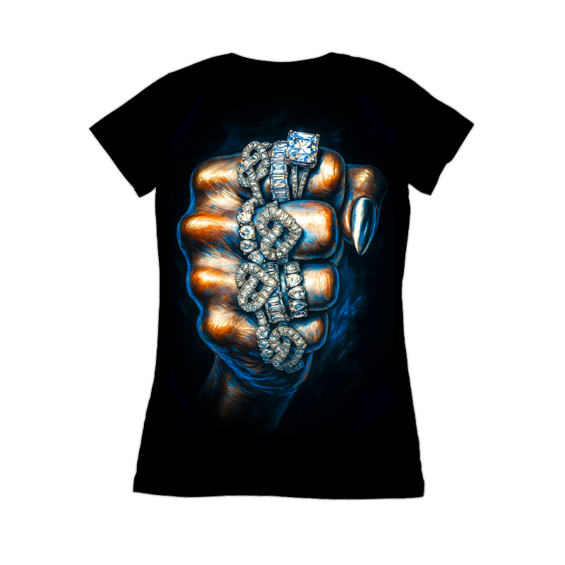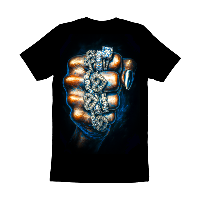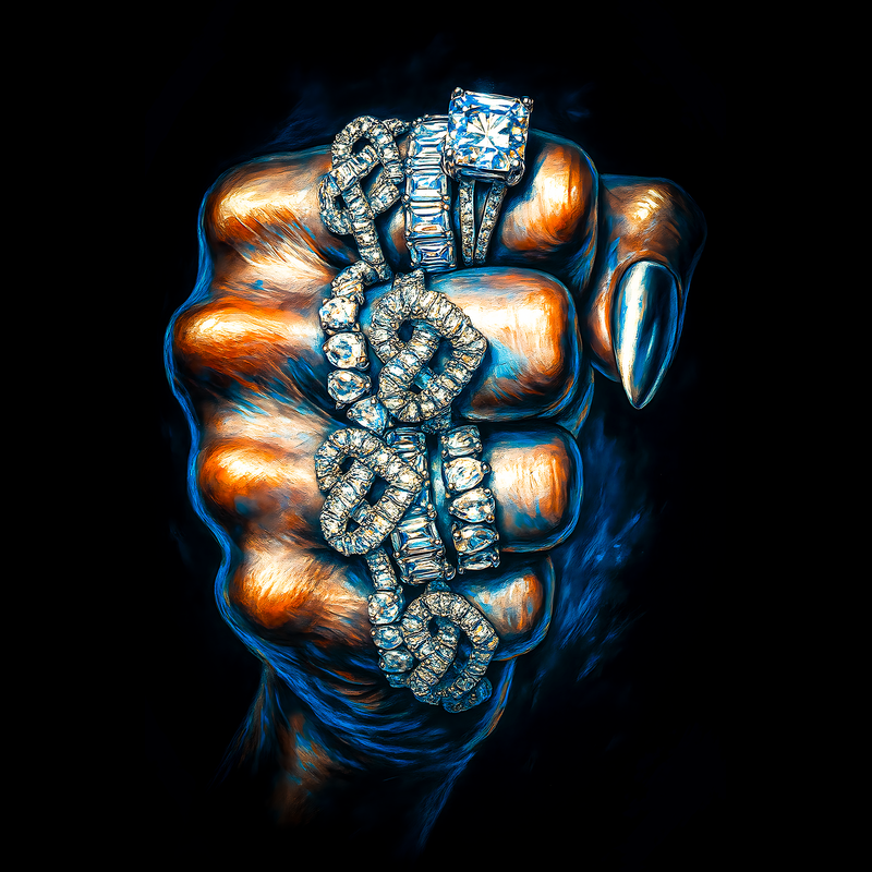 This image showcases a powerful fist adorned with several sparkling diamond rings. The fist, rendered in shades of bronze and blue, exhibits a painterly style with visible brushstrokes, adding depth and texture. The rings are the focal point, each meticulously detailed to capture the brilliance and facets of the diamonds. The arrangement of the rings, stacked and layered on the fingers, adds a sense of opulence and extravagance. The background is a stark black, which serves to highlight the vibrant colors of the fist and the dazzling sparkle of the diamonds. The overall composition exudes a sense of strength, wealth, and sophistication, making it a visually striking and memorable design.
