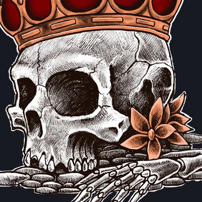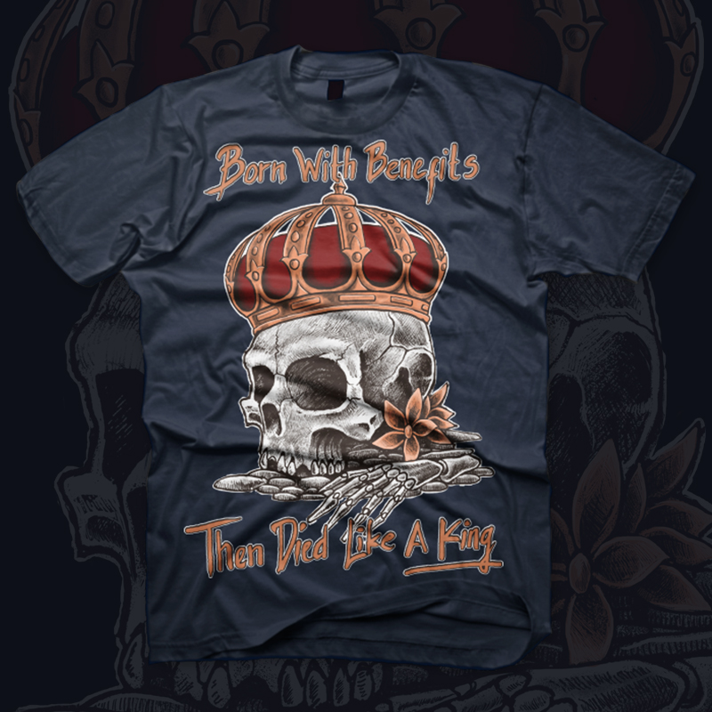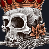 ''die like a king '' is unique Illustration of a skull head with a crown. with the dark red for background and use pastel colors pallete...Made with hand painting looking and dark style. Ready to print on t-shirt.