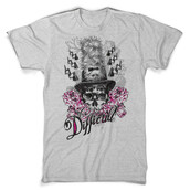 Lady with big feather hat behind skull mask