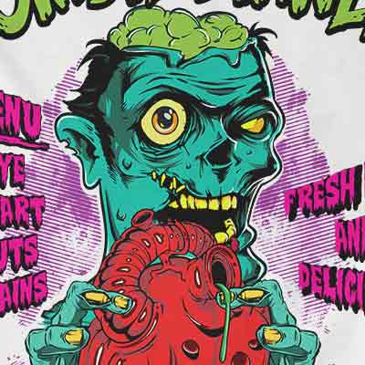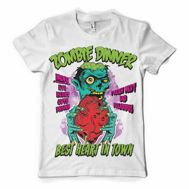 Dinner t-shirt design features a detailed screen print of zombie eating heart now available for Adobe Illustrator, Adobe Photoshop and Corel Draw and can be used for digital printing and screenprinting .