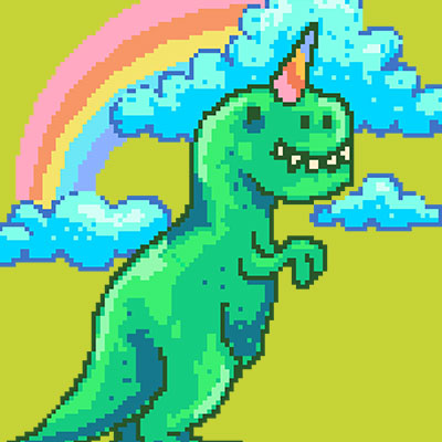 Dino Corn is the cute combination of unicorn and dinnosaur t-rex in a beautiful rainbow sky. This design made with pixel art illustration.