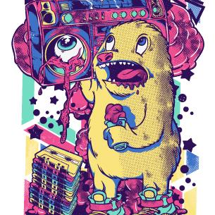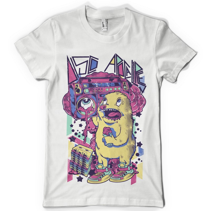 Disco apocalypse design template in vector format, featuring detailed cute creature holding an eye now available for Adobe Illustrator, Adobe Photoshop and Corel Draw and can be used for digital printing and screenprinting .